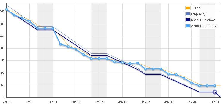 This diagram is an example of a burn down chart, which is a graphical representation of work left to do versus time. It is useful for giving a visual representation of the state of the project and for predicting when all the work will be completed. It shows the sort of higher-level information that can be generated and distributed to interested parties if a development team employs short iterations and measures their progress.