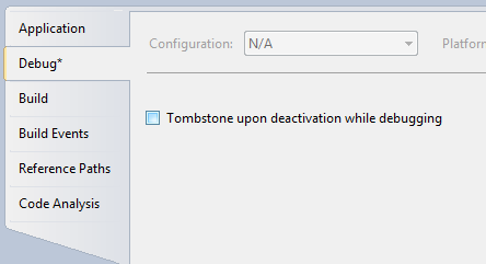 So, if your application always moves into a dormant state, how do you test your tombstoning code? Fortunately there is a build setting which you can enable which will ensure that your application is always tombstoned rather than placed in a dormant state: