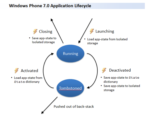 One other thing that the Execution Model Overview on MSDN does not make terribly clear is that the back-stack has a limited size. What this means is that your tombstoned application state will not necessarily be re-activated. You can test this by running your application with the debugger attached, if you create a long enough back-stack (by repeatedly hitting the Start button and starting a new application), your debugging session will eventually terminate. This occurs when your application state has been pushed off the back-stack.