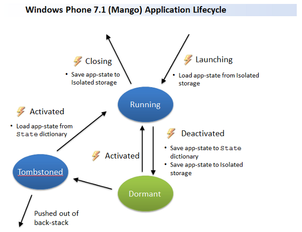 In a previous blog post I described the development of a simple Windows Phone 7 application using the Model-View-ViewModel (MVVM) pattern and how to handle application lifecycle events, specifically tombstoning. In this blog post I will look at updating this sample for Windows Phone 7.1 (Mango) to handle fast-app switching and the new Dormant state.
