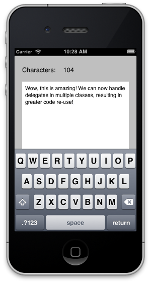 This behaviour can now be added to any UITextView without interfering with application-specific logic. For example, this simple view controller also handles the UITextViewDelegate in order to display a character count: