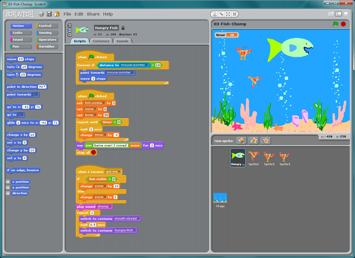 5. Have fun! Code Club can be hard work, so take a step back and enjoy it! Give the students time to play the games they create, especially when they need two players! The students will quickly come up with new ideas and begin implementing them! Students will also want to put their own spin on the games. Wherever possible, allow them to do so. It’s not always possible to deviate from the lessons, such as with Fish Chomp (collision detection is performed on a fish’s teeth, which is not possible on all sprite images), so be aware of where the students will have to be more constrained. If they’re having fun, you’ll be having fun and they’re learning!