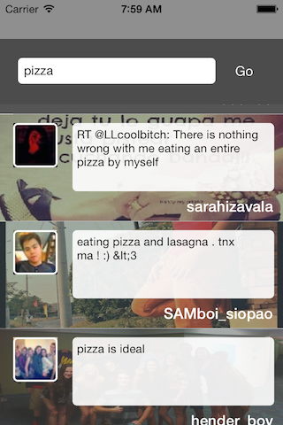 } Note that because the properties of the CETweetViewModel do not change, their values are copied directly to the corresponding UI control. Although, there is of course nothing stopping you from using ReactiveCocoa to bind the two together if the values change.