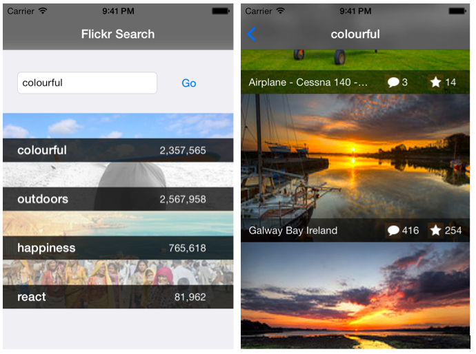 The complete Swift version of this app can be found on GitHub. Here are a couple of screenshots of the app that searches for pictures on the popular photo sharing site, Flickr.
