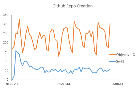 As you can see, the day after Swift was release, a large number of Swift repos were created as developers raced to create the first FlappyBirds clone or the de-facto utility belt library (a race which Dollar.Swift seems to have won).