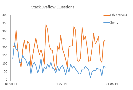 Again, a sudden burst of Swift activity, which gradually subsiding to the point where there are roughly 3x as many Objective-C questions than Swift questions asked.