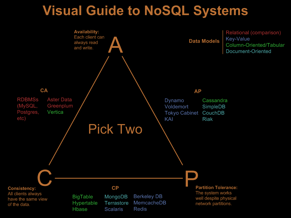 As you can see, there are three primary concerns you must balance when choosing a data management system: consistency, availability, and partition tolerance.