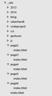 {% endfor %}Generating your site using the pagination option results in Jekyll creating multiple copies of the index page, each containing the posts for the given page. The first page, index.html resides in the usual location, whereas subsequent pages reside in numbered sub-folders starting at page2: