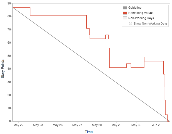 During the sprint, we estimated tasks in days and hours depending on how many “developer-hours” we had that fortnight, taking into account team size and upcoming holidays. When work was done, we would log hours against the task and chart the remaining time as a burndown chart.