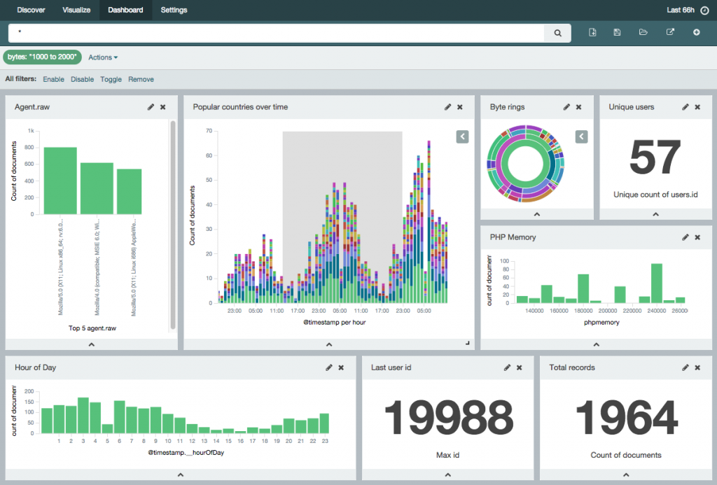 • Kibana - A browser-based interface served up from a web server. It’s job is to allow you to build tabular and graphical visualisations of the log data based on elasticsearch queries. Typically these are based on simple text queries, time-ranges or even far more complex aggregations.