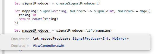 Emitting a next eventUsing Xcode you can confirm that the original signal producer of type SignalProducer<String, NoError> has become a producer of type SignalProducer<Int, NoError>:
