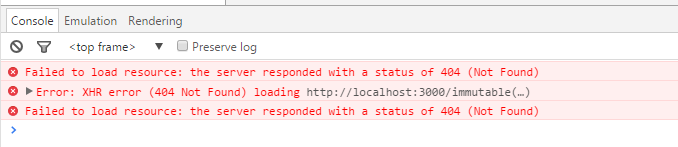 The error indicates that the SystemJS module loader is attempting to load the immutable module via an XHR request, however the file cannot be found.