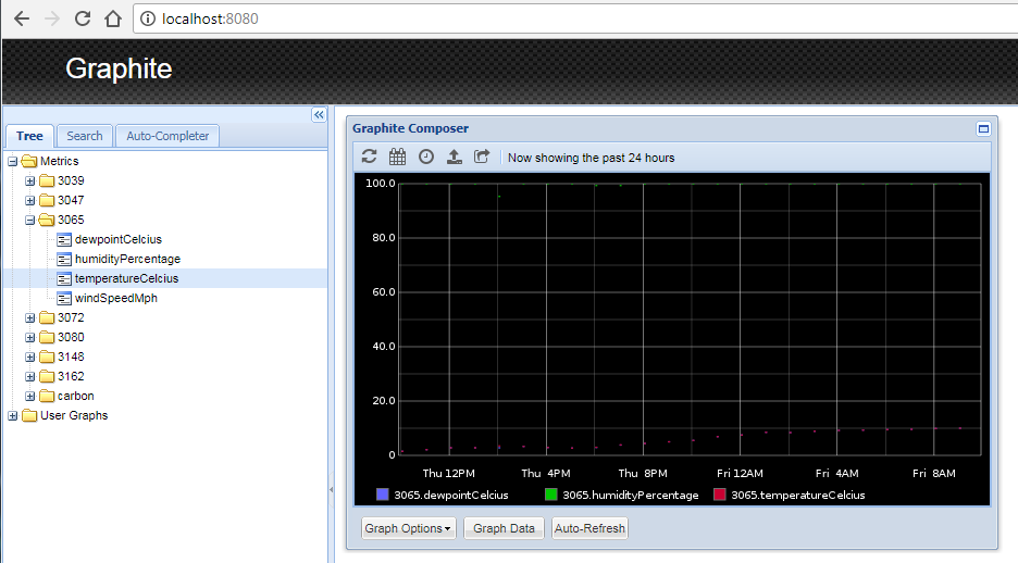 A look at the web dashboard shows that the data has been successfully stored in Graphite: