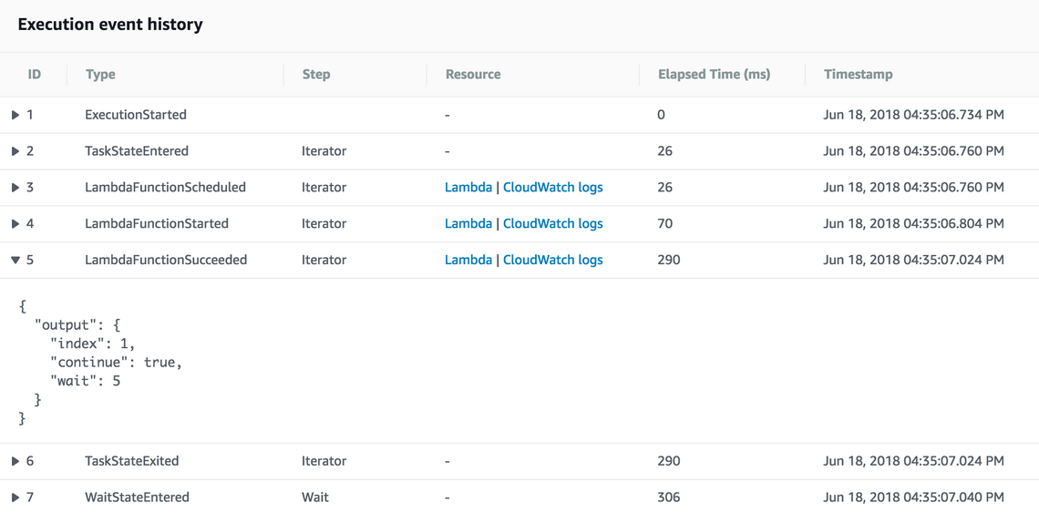 I also found the features of the console a little lacking in places. While you can easily see inputs and outputs for states, you often need to view the logged output from your lambda functions. The interface provides a link to Cloud Watch, but rather than directing you to the output relating to the current execution, it just takes you to the Log Group.