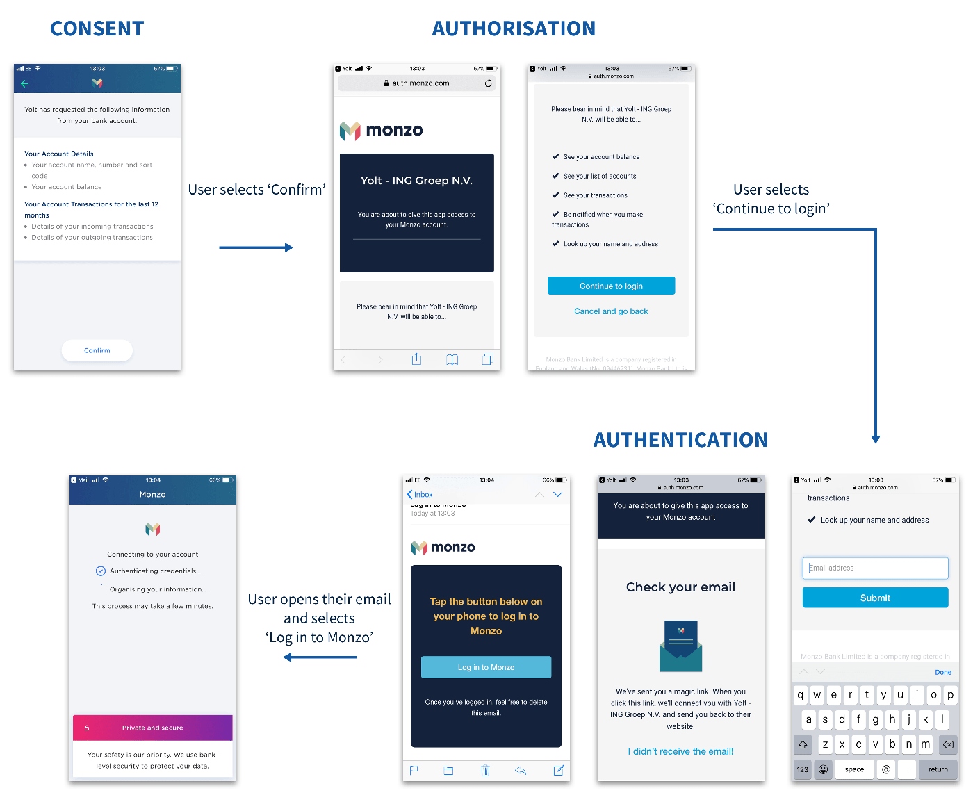 However, the consent flows that both Monzo, shown here, and Starling Bank (as we will discuss next) follow within Yolt are quite distinct to what the other API connected banks are using. These approaches have their own pros and cons, but this inconsistency can be confusing to users who may be wondering if these challenger banks are indeed connected via API and whether or not the TPP can view their credentials.
