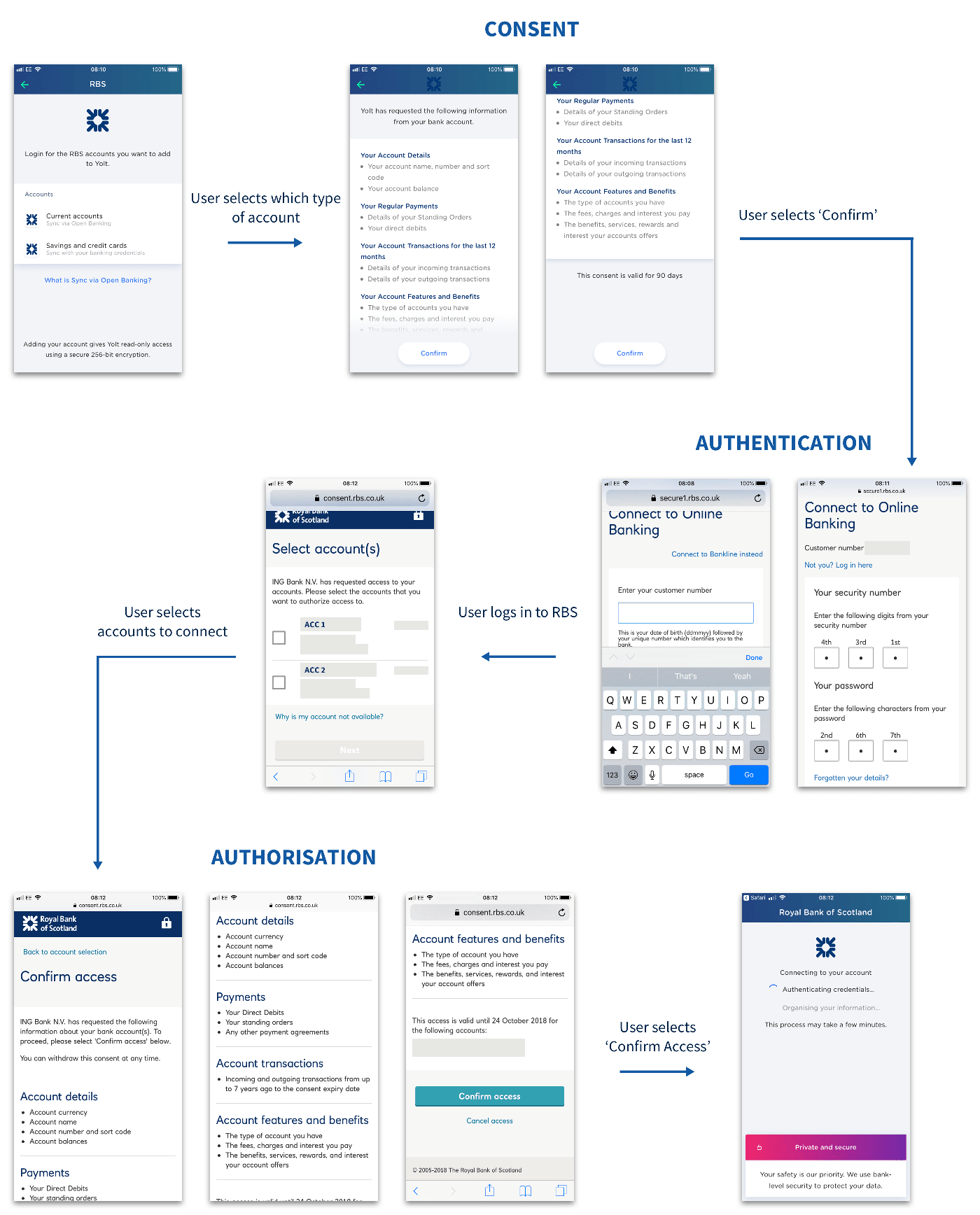RBS, another of the CMA 9, has a slightly more efficient consent flow. It, like BOS, adheres to the three step process of consent, authentication and authorisation, and again uses a web journey to create a distinct experience from the third party’s section of the model. Again, the same credentials used for online banking are required, but in contrast to BOS, users who bank with RBS can actually select which specific accounts they would like to connect to Yolt. This helps give the users more control of their data, with some users potentially only feeling confident sharing their less important accounts to begin with as a first foray into Open Banking.