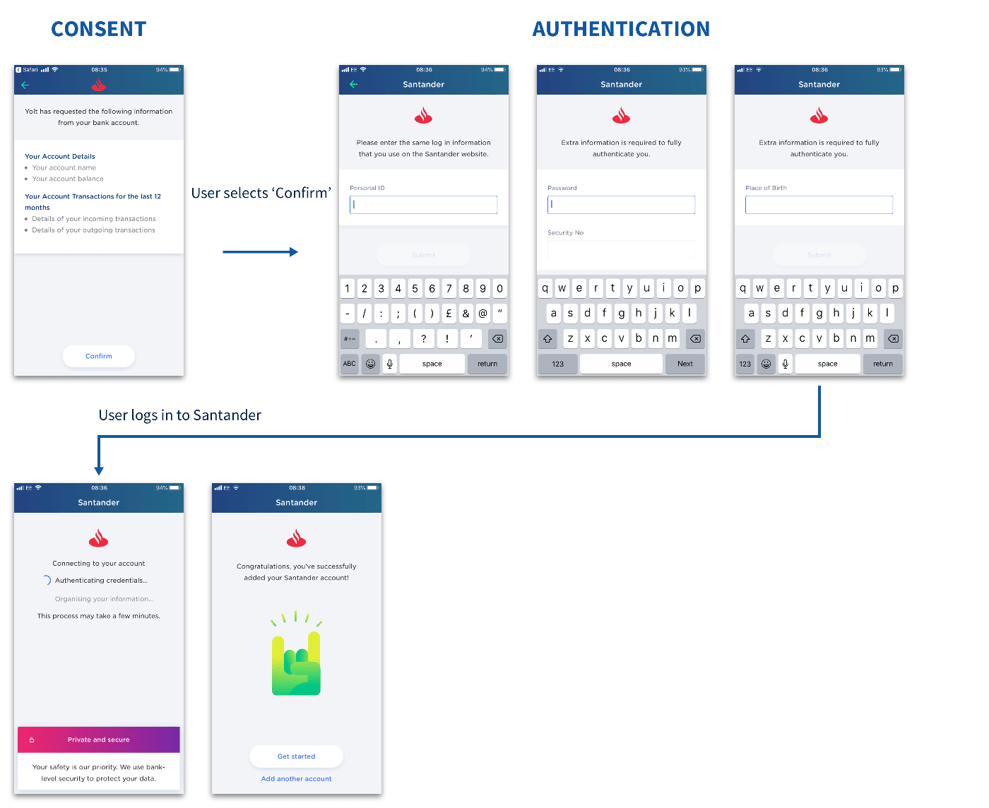 2. Authentication Stage - The bank takes over the experience, verifying the user’s identity and reassuring them that the TPP can not see their credentials. The OBIE suggests making this step distinctive from the TPP’s part of the flow to make the user feel more reassured. They also suggest that banks use the same login/credentials process as their online banking to further create familiarity and trust.