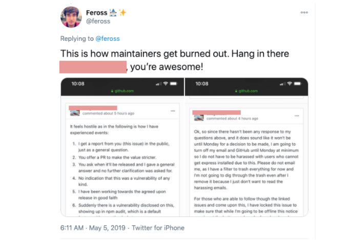Without going into the details, a potential security issue with Express was highlighted. What followed was various differences of opinion, quite a lot of “security theatre” (commercial security products labelling Express as insecure), hostility and heated exchanges. As a result, the maintainer publicly stepped away from the project for a short period of time.