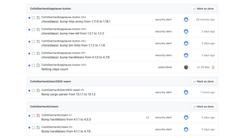 Unfortunately in practice, this tends to generate nothing but noise and distraction. For example, dependabot bombards me with dependency ‘bumps’ due to potential security issues almost every week.