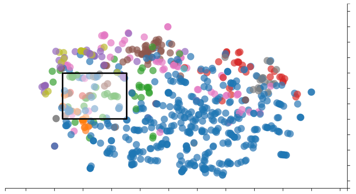 Here we can see a cluster of a few articles, which belong to different categories, yet explore similar themes. This demonstrates the power of embeddings to identify similar content.