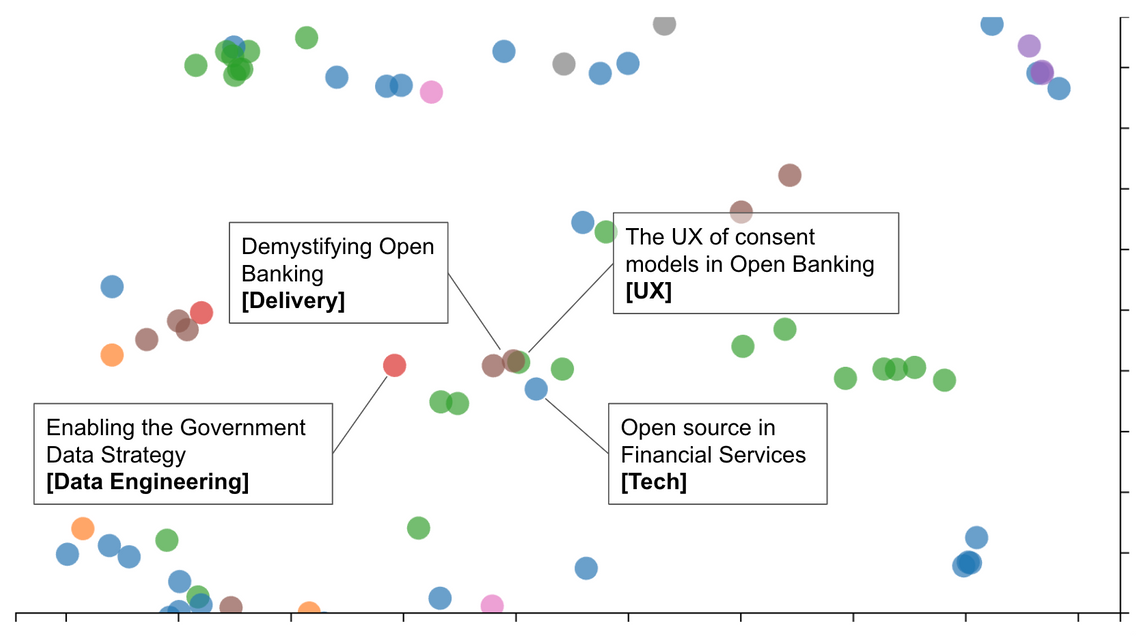The red dots in the top right are articles within our data engineering category, these overlap quite a bit with the grey dots which represent articles in the cloud category (no great surprised, the topics are very closely related). Elsewhere in this “cloud”, brown at the top are from the delivery category, and the great big block of blue is the somewhat ambiguous Tech category which we tend to use for pretty much everything!