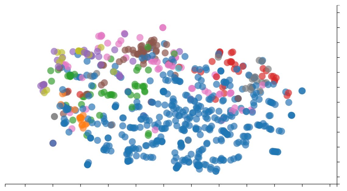 An interesting byproduct of computing the embeddings for each article is that it is possible to visualise the blog content. There isn’t an easy way to visualise such a high-dimensional vector space, so some technique needs to be used to reduce the number of dimensions down to something more manageable, typically two or three. A popular approach for this is t-distributed stochastic neighbor embedding, or t-SNE for short. This technique reduces dimension, whilst maintaining structure and proximity. If you’ve not used t-SNE before, I’d recommend this article which shares lots of practical examples and advice.